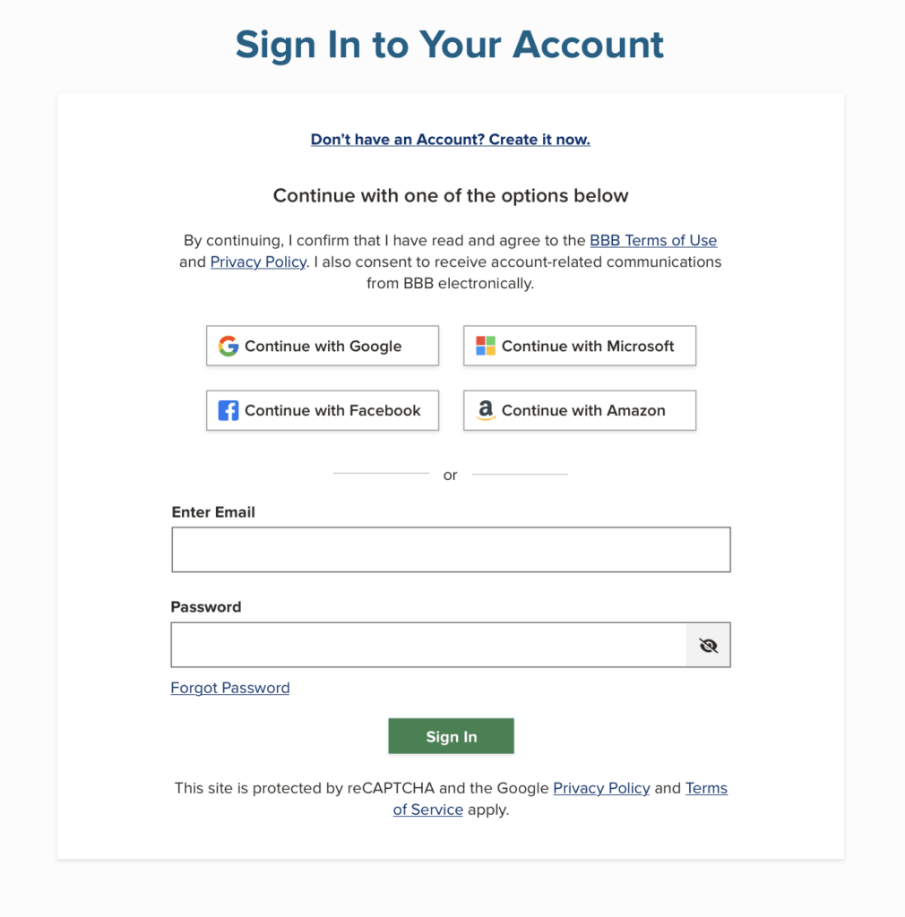 Several conflicting call-to-action buttons; social accounts are not supported unless they are returning users; first-time users need to go through the ‘fogot BBB password’ link to register, which is confusing. Business owners can’t easily switch to their consumer account.