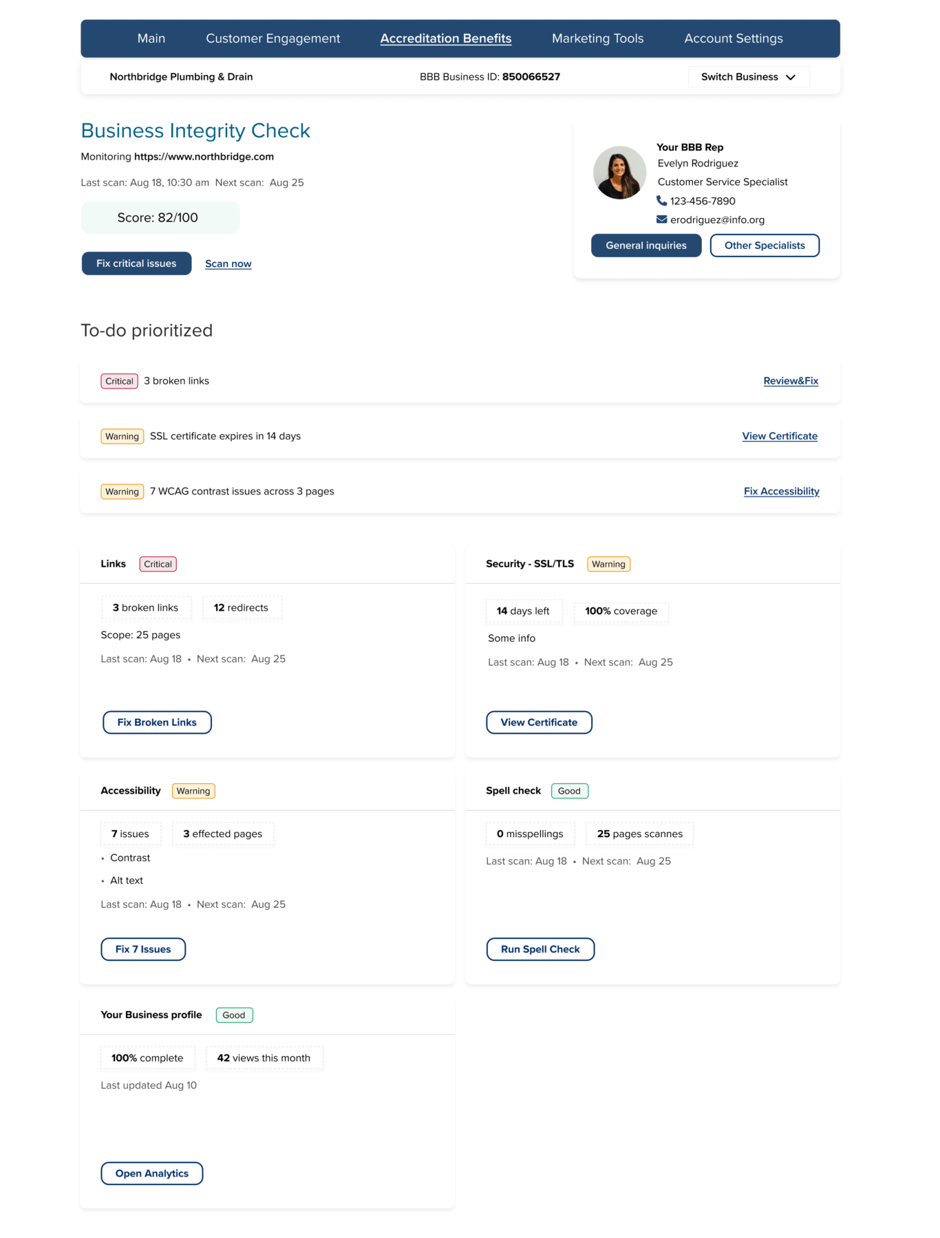 Goal: Deliver a streamlined self-service experience that helps businesses understand their performance and take meaningful action to improve trust.