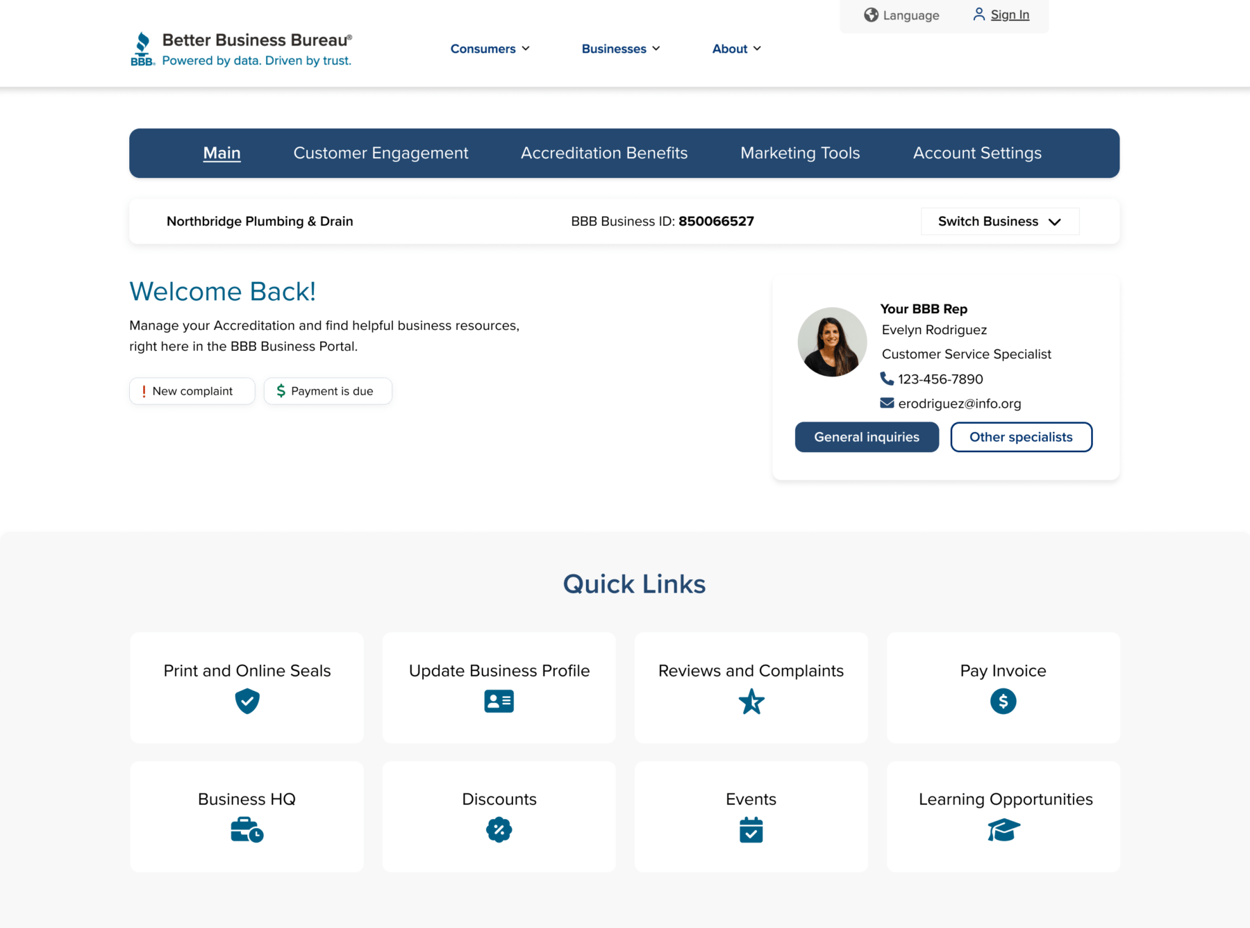 The BBB website supports millions of businesses and consumers. With two existing portals: one for personal use and one for business, it lets small and large businesses manage their accreditation, profile visibility, billing, and customer interactions. The legacy version used outdated interface patterns with unclear hierarchy, resulting in unnecessary customer support volume and low adoption of digital tools. Business owners can also have a consumer account, but they need a separate portal to sign in.